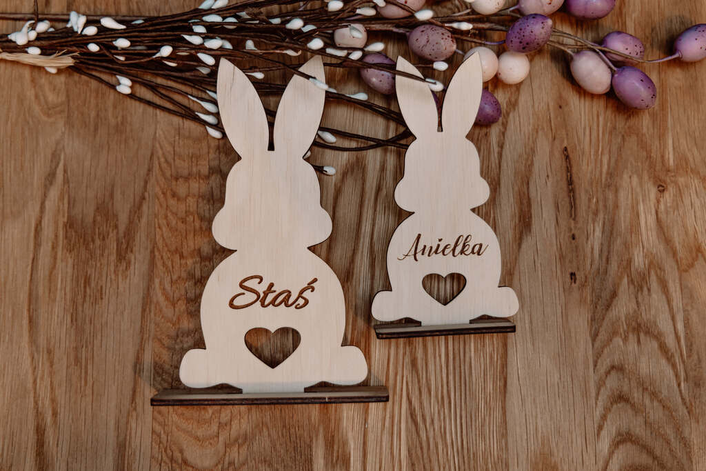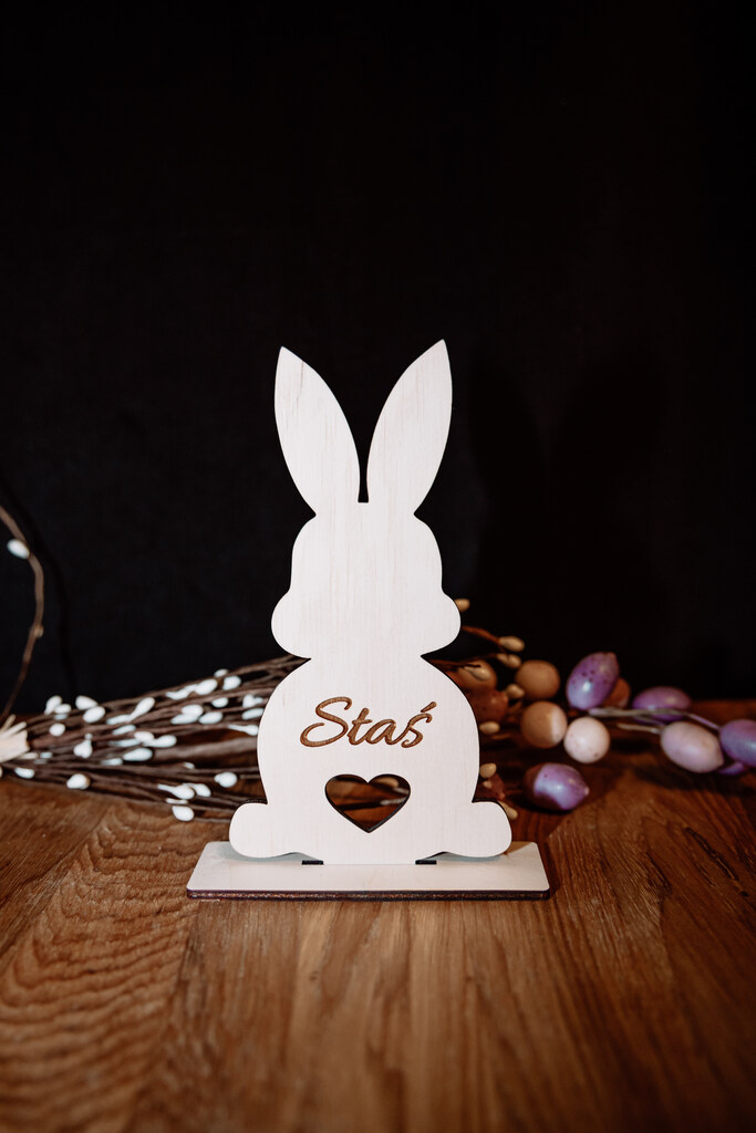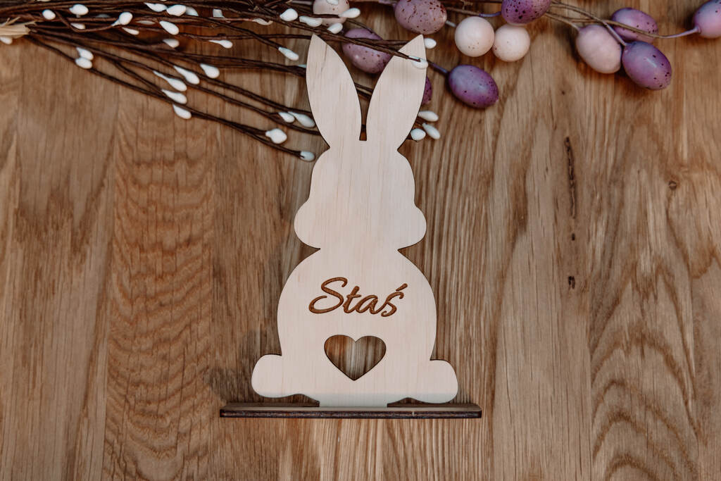 Odkryj nasz uroczy, personalizowany zajączek ze sklejki, idealny jako dekoracja wielkanocna lub wyjątkowy prezent. Wykonany z wysokiej jakości sklejki, ten elegancki zajączek na podstawce, z możliwością dodania imienia, jest doskonałym sposobem na dodanie osobistego akcentu do świątecznego dekorowania.