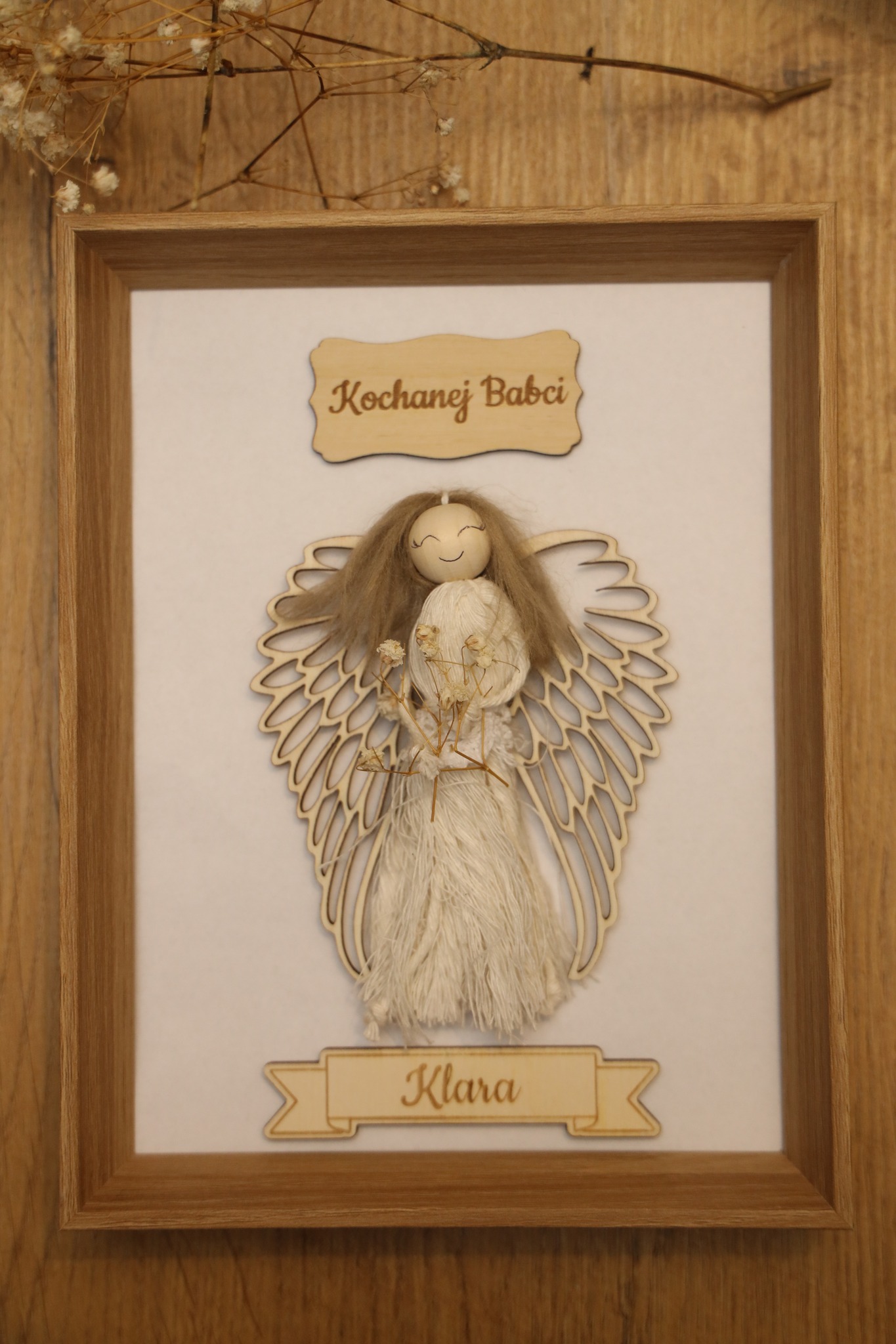 Wyjątkowy, ręcznie wykonany aniołek dla Babci zamknięty w eleganckiej, naturalnej drewnianej ramce to piękna pamiątka pełna emocji i symboliki. Subtelna dekoracja, która wyraża miłość, wdzięczność i pamięć – idealna na Dzień Babci, urodziny, imieniny lub jako wzruszający upominek bez okazji.
