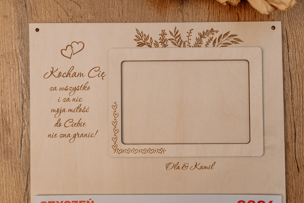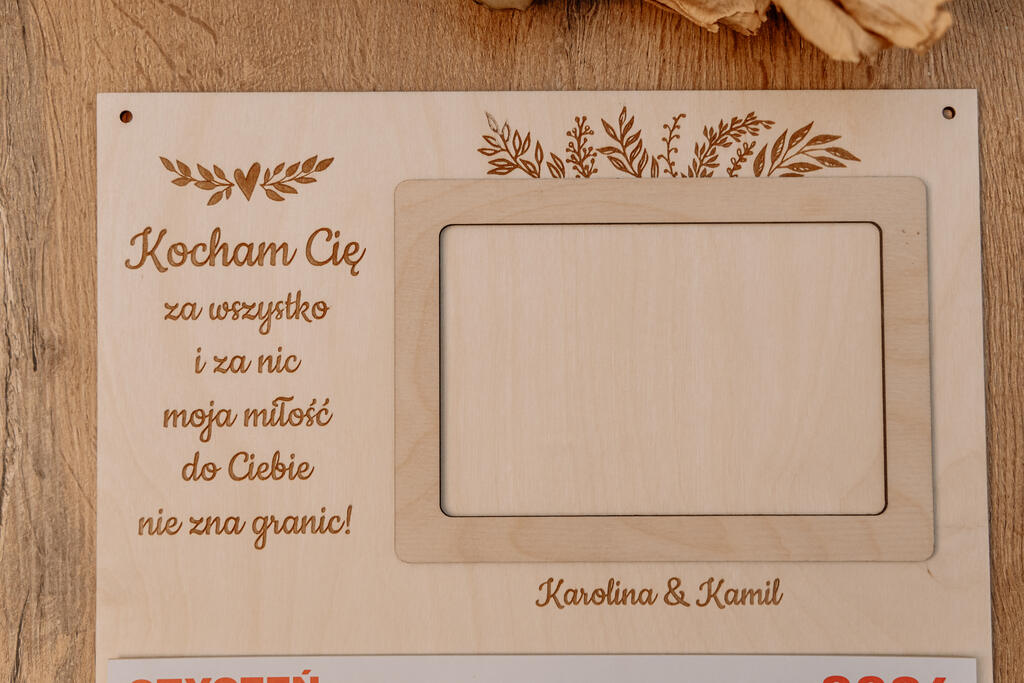 Personalizowany Kalendarz z Imionami, Ramką na Zdjęcie i Cytatem na Sklejce
