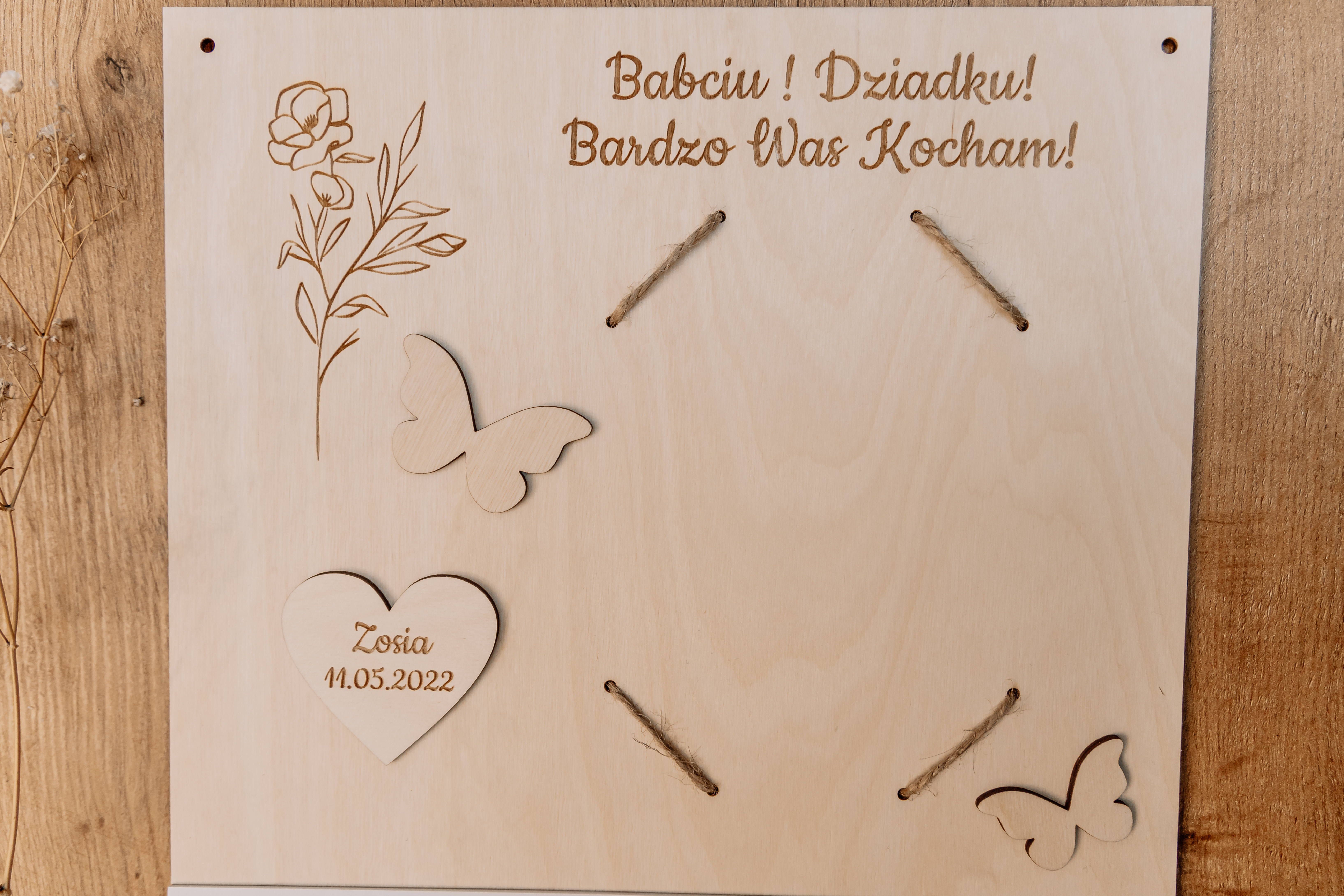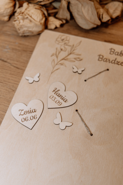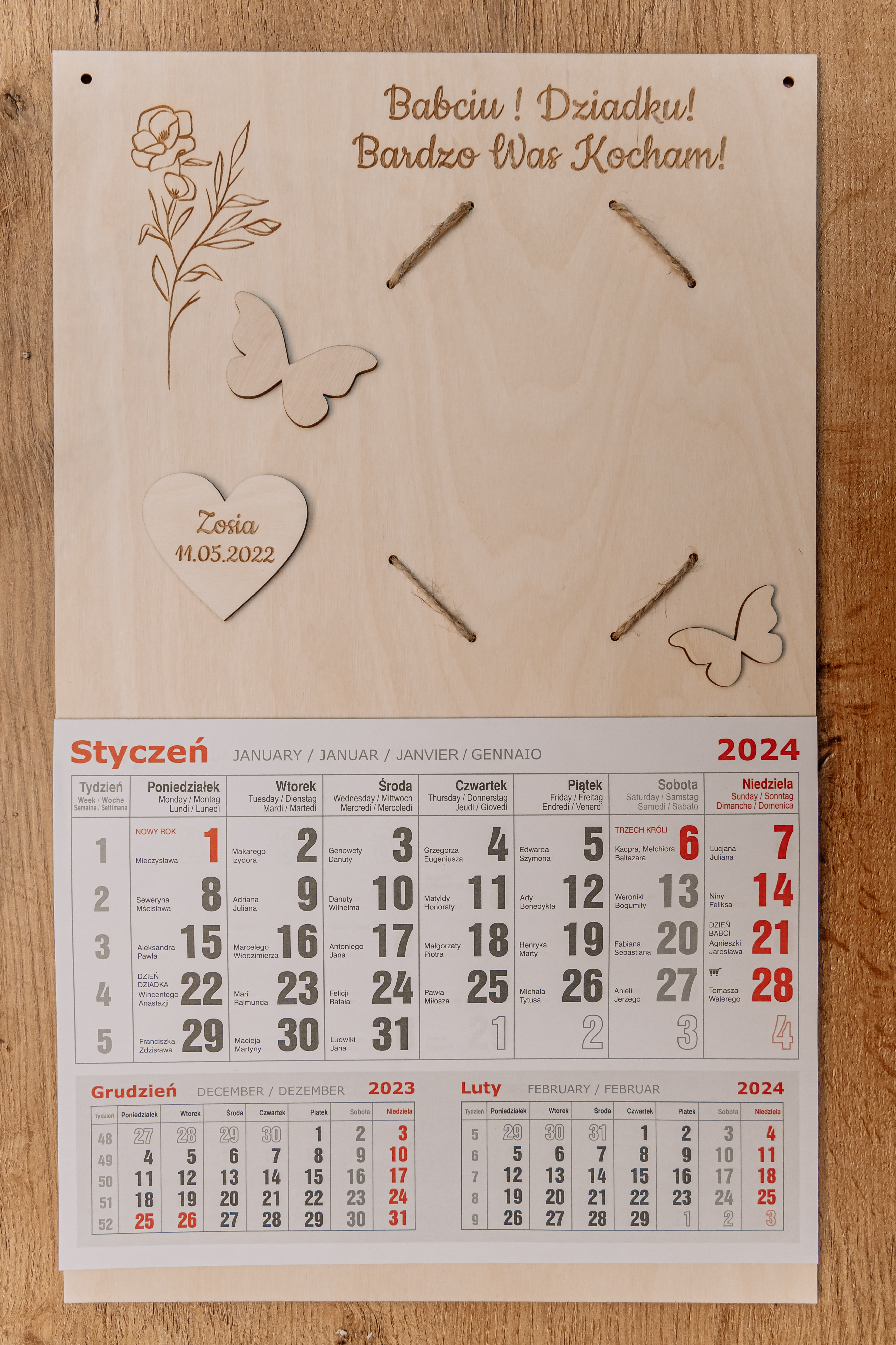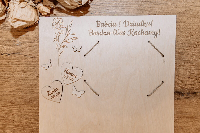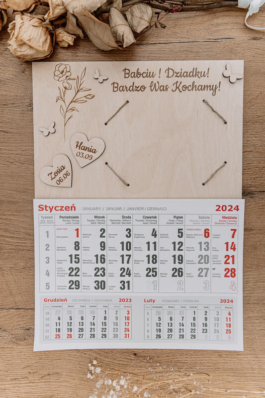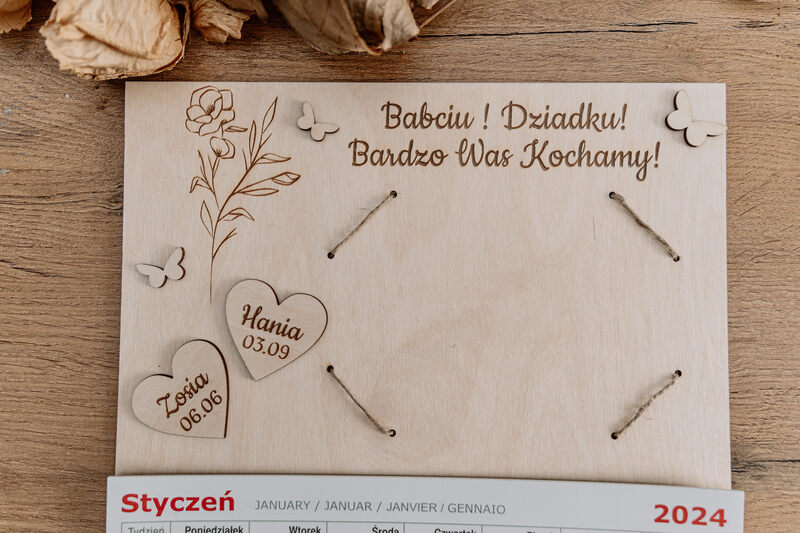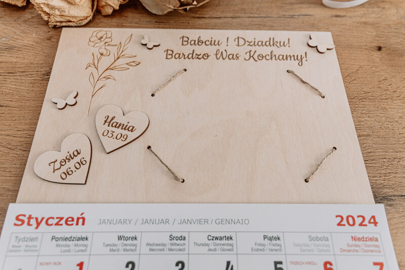 • Grawerowane Serduszka: Na pierwszej stronie kalendarza grawerujemy serduszka z imionami wnucząt oraz ich datami urodzenia.