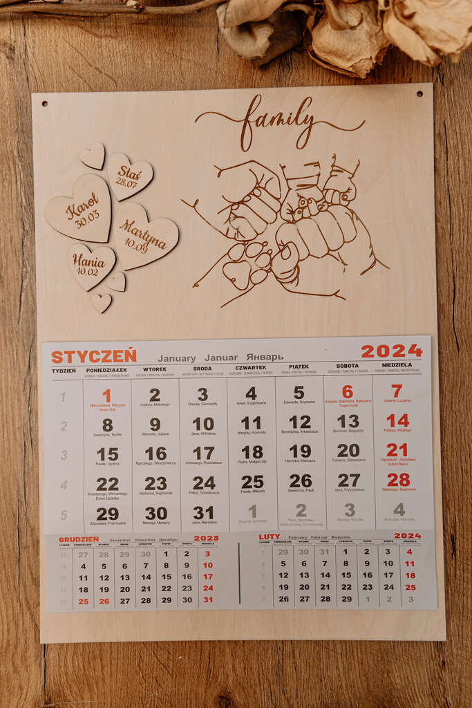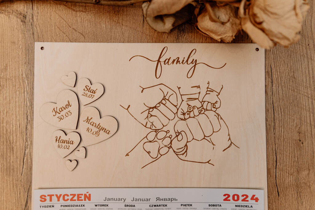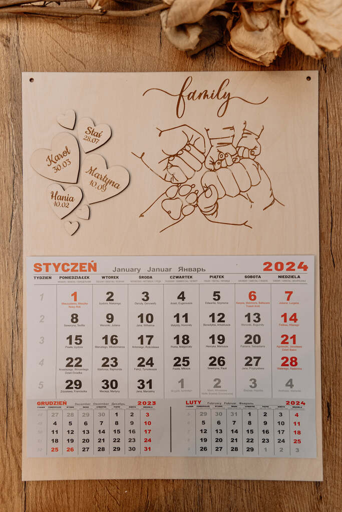 Odkryj wyjątkowy, personalizowany kalendarz rodzinny, który jest znacznie więcej niż zwykłym organizatorem czasu. Ten kalendarz zawiera serduszka z wygrawerowanymi imionami i datami urodzin członków rodziny, a także uroczą grafikę przedstawiającą ręce rodziców, dzieci oraz opcjonalnie kota lub psa.