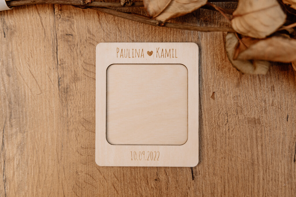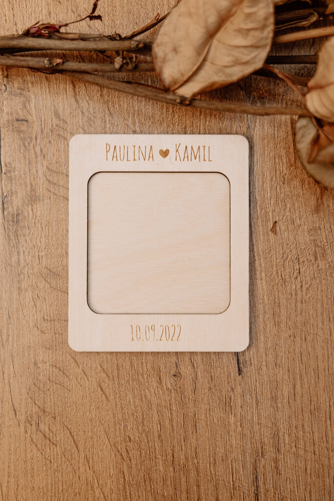 Odkryj naszą atrakcyjną i funkcjonalną ramkę magnetyczną na zdjęcie, wykonaną z eleganckiej sklejki. Ta ramka, idealna na zdjęcia o wymiarach 75×75 mm, została zaprojektowana z myślą o parach, które chcą uwiecznić swoje wspólne chwile. Na górnej części ramki wygrawerowane są imiona, a na dolnej części – ważna data, co dodaje jej indywidualnego charakteru. Całkowity wymiar ramki to 95×115 mm, sprawiając, że jest idealna do umieszczenia na lodówce lub innej metalowej powierzchni.